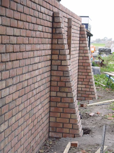 - Muur van straatstenen (klinkers) als onderlaag voor kapschuur.